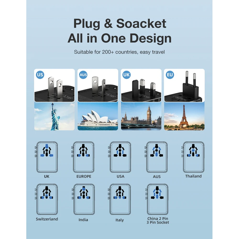 * 45 Watt * 200+ Ülkede şarj imkanı * Ebat: 5.47 x 7.54 x 5.3 cm * Çıkış: USB, Type C, PD